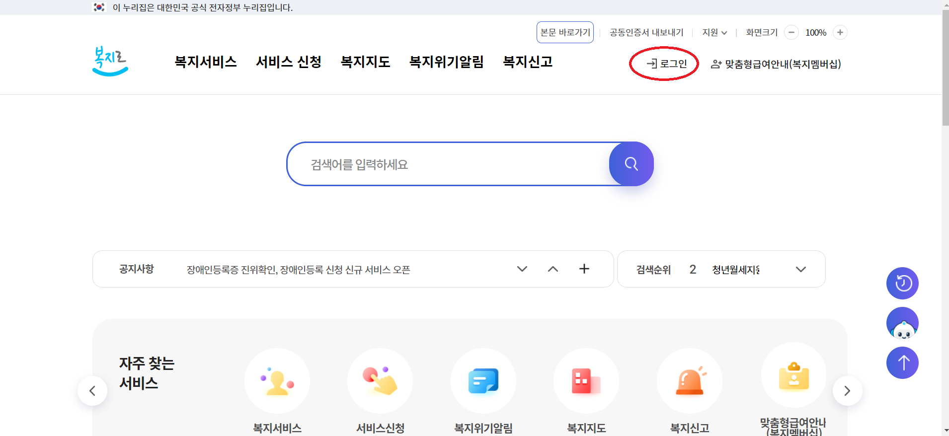 서비스 신청에서 장애인등록증 진위 확인 클릭