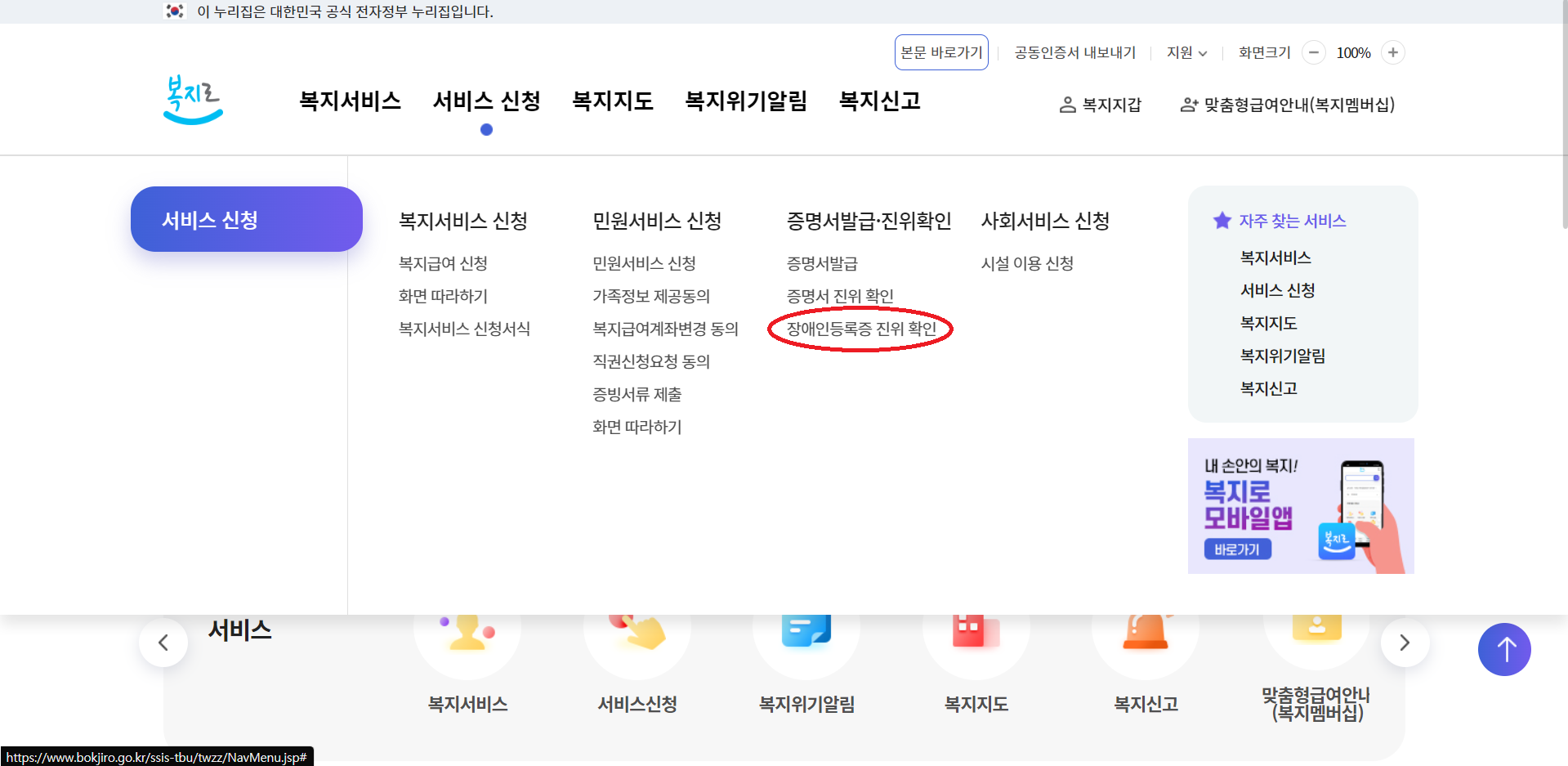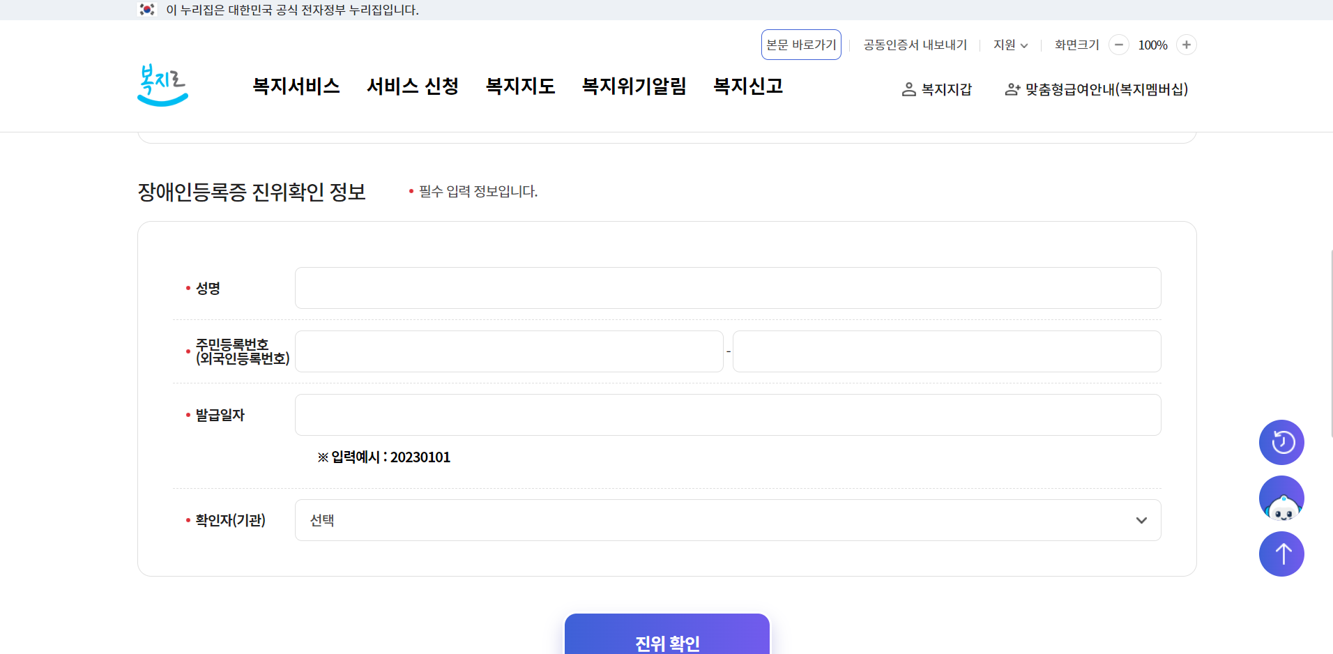 서비스 신청에서 장애인등록증 진위 확인 클릭