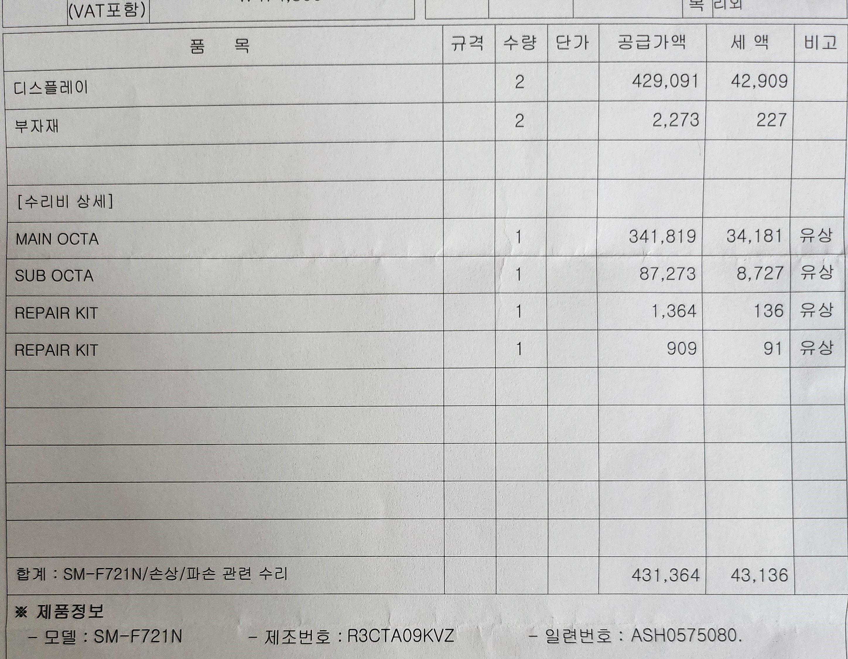 총 475,000원 나왔내요. 핸드폰 보험이 들어져 있었는데 개인 부담금이 25%라서 119,000원 정도 들었내요. 밧데리까지 일체형이라 밧데리까지 자연스럽게 교체된다고 하더라구요. 거의 다 갈아버리는거 같아서 비용이 걱정되었는데 12만원 정도면 다행이라는 생각이 드내요.
