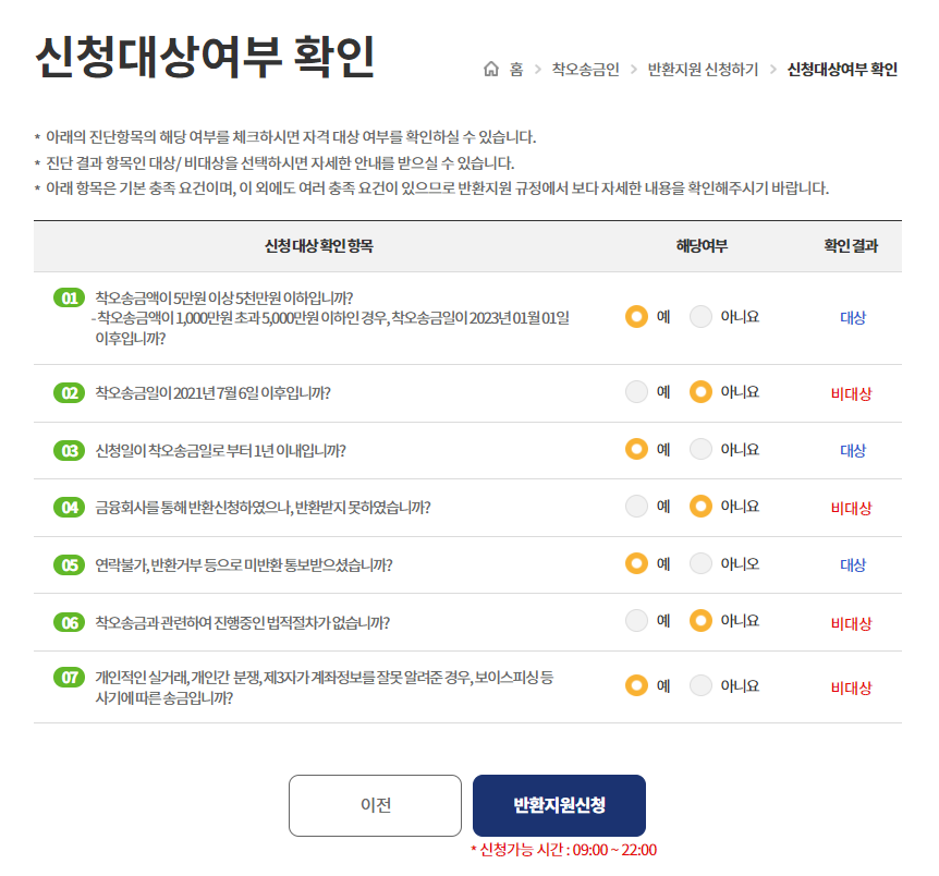 해당여부를 체크하면 대상/비대상이 표시되며 신청대상여부를 확인할수 있습니다.