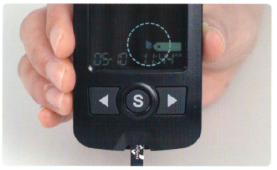 7. 채혈기에 부착된 스트립지 끝에 혈액을 투입하고 숫자가 뜰 때가지 기다립니다.