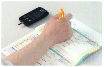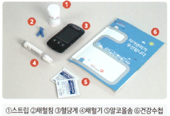 1. 손을 씻고 혈당계와 스트립, 채혈침, 채혈기, 알콜솜, 건강수첩을 준비합니다.