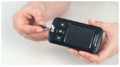 4. 스트립의 사각형 모양이 기계 쪽을 향하도록, 검정면이 위를 향하도록 스트립을 혈당기에 꽂습니다.