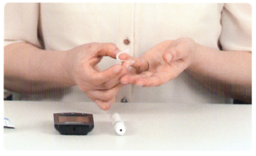 6. 채혈부위를 알콜솜으로 닦은 후 알콜이 마를때까지 기다린 후 채혈침으로 혈액을 채취합니다.