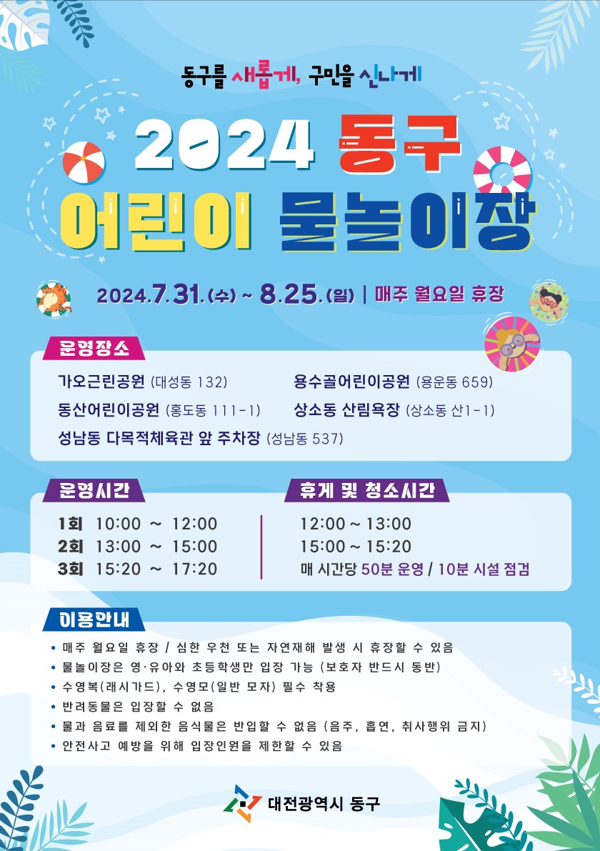 대전 동구에 무료 어린이 수영장을 개장한다고 합니다. 입장 인원 제한도 있고 매일 매회 선착순 입장 원칙도 있으니 반드시 읽어보시고 계획을 세우시기 바랍니다.