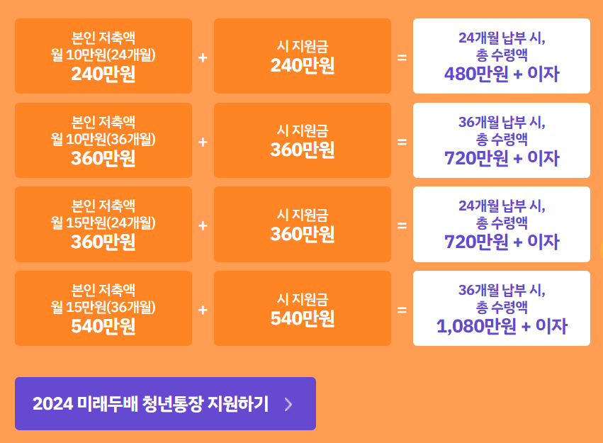 3년, 매월 15만원 납부 시 1,080만원 (본인 540만원, 시 540만원 + 이자)