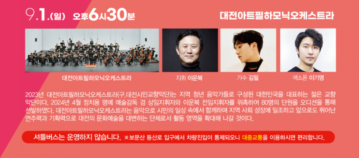 대전에서 여름이 끝나갈때쯤이면 보문산에서 음악회를 하는데 작년에 갔을 때 너무나도 좋았었습니다. 무료로 음악회가 열리고 너무나도 잘 알려진 뮤지컬가수 부부 김소현, 손준호 커플과 목소리가 너무도 멋진 가수 김필씨도 출연한다고 하니 안가면 손해일꺼 같네요!