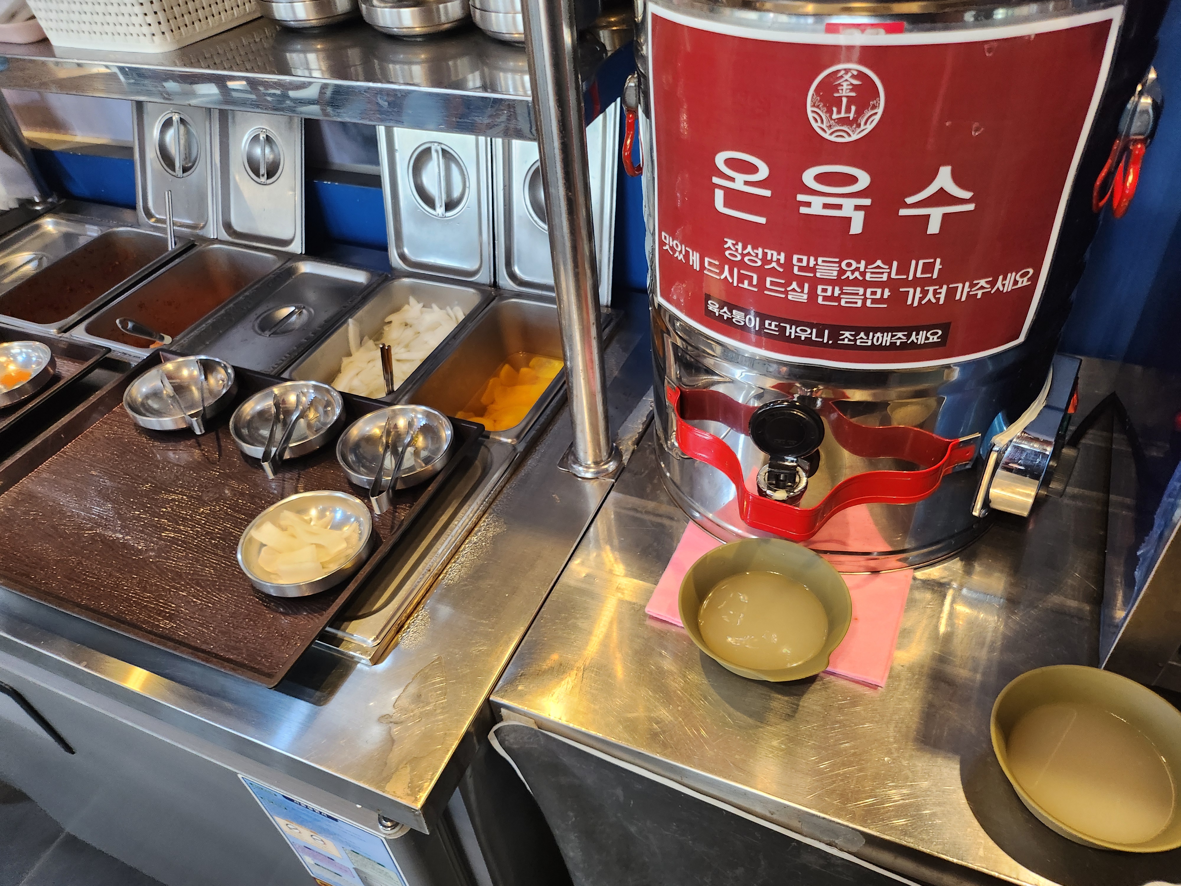 반찬은 처음에는 갖다주시고 그 이후로는 셀프입니다. 육수통 옆에 준비되어 있습니다.