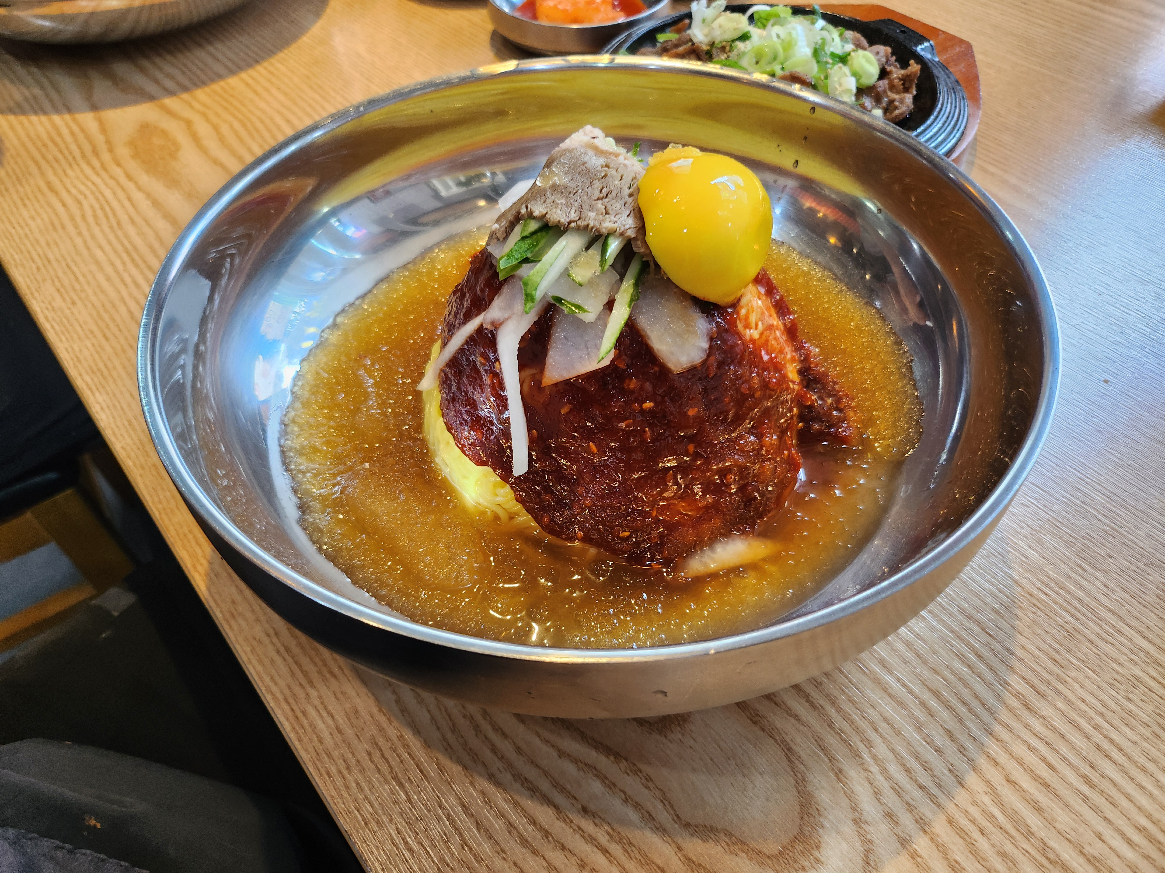면 사리추가한 강황물비빔면입니다. 사리추가가 3000원이나 해서 비싸긴 합니다만 양이 딱 봐도 매우 만족스럽습니다. 저는 어딜가나 곱빼기를 먹어서 비용이 좀 아쉽긴 했네요 ㅠㅠ 맛은 정말 최고다라고 할 순 없지만 맛있습니다. 특히 연탄불고기를 얹어 먹으면 정말 맛있습니다. 이 주변을 지나가다가 시원한 면이 먹고싶다면 와서 드셔보시면 좋을꺼 같아요.