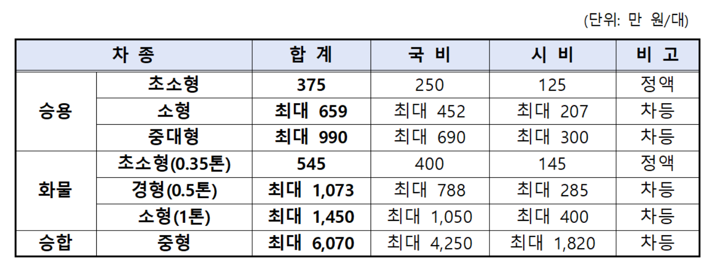 ※ 각 차종별 보조금액은 [별표1] 참고(환경부 지침 개정으로 인한 차종별 보조금액 변경 시 별도의 공고없이 변경된 보조금액으로 적용함)