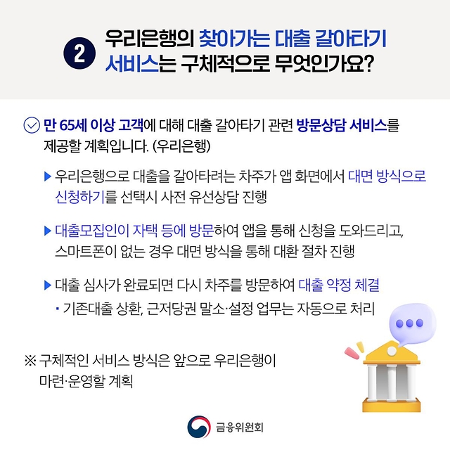 Ⅴ 만 65세 이상 고객에 대해 대출 갈아타기 관련 방문상담 서비스를 제공할 계획입니다. (우리은행)