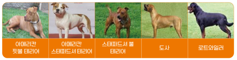 도사견, 핏볼테리어(아메리칸 핏볼테리어 포함), 아메리칸 스태퍼드셔 테리어, 스태퍼드셔 불 테리어, 로트와일러 등 5종 및 그 잡종의 개