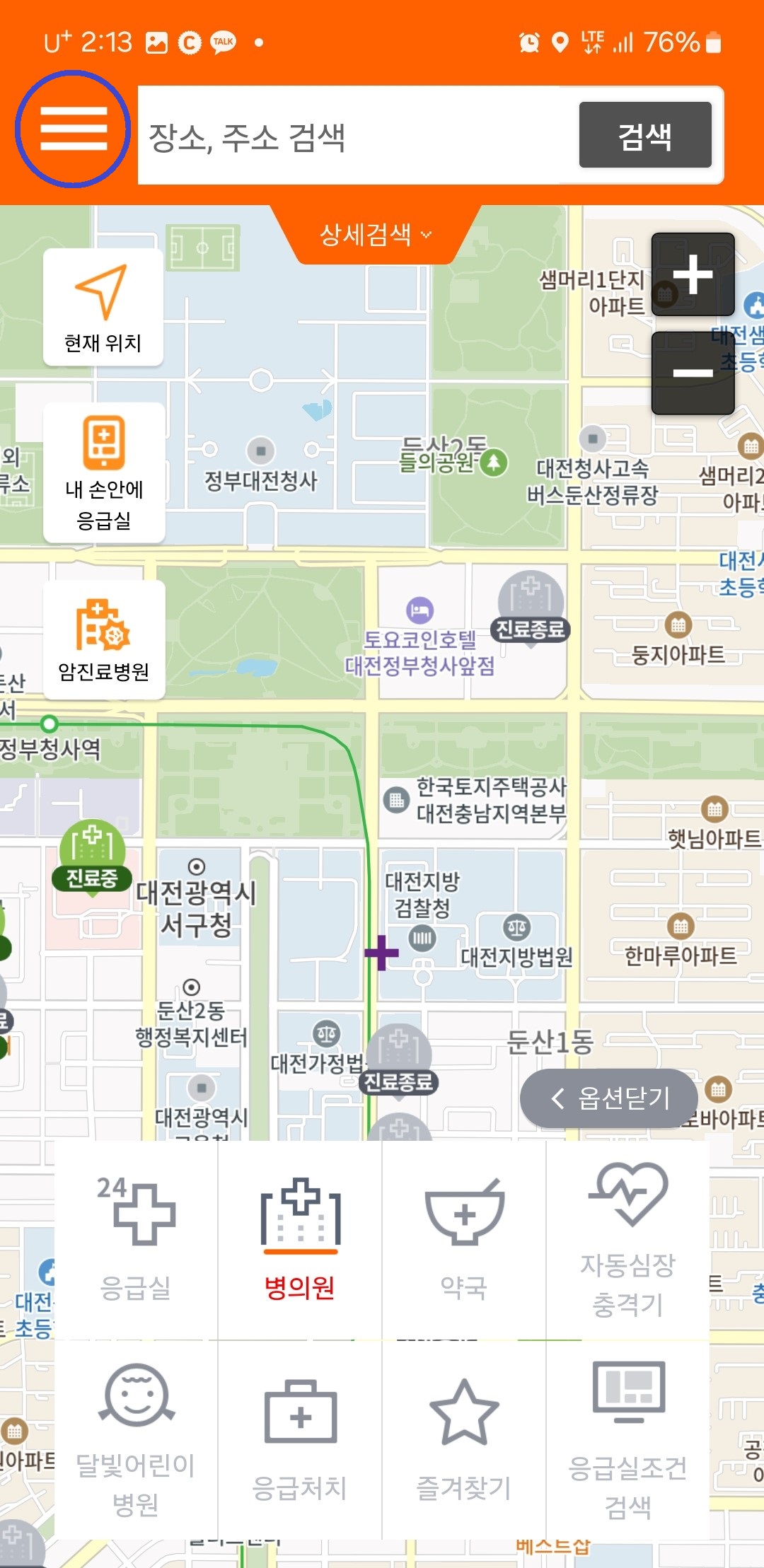 현재 위치를 누르거나 장소나 주소를 직접 검색하면 쉽게 검색할 수 있습니다. 혹시 정보다 다를 수 있다고 하니 검색하신 병원에 직접 연락하셔서 확인해 보시면 좋을것 같습니다.