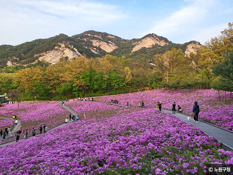 서울 불암산 철쭉제는 매년 4월 노원구 불암산 힐링타운에 조성된 철쭉동산에서 진행되는 철쭉 축제입니다. 철쭉 개화 시기에 맞춰 이곳을 방문하면 드높은 불암산을 배경으로 데크 길을 거닐며 진분홍빛 철쭉 군락을 감상할 수 있는데요.