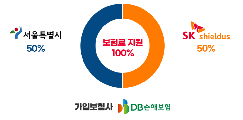행정안전부와 서울특별시가 풍수해보험 보험료 중 50%를 지원하고, SK쉴더스가 나머지 50%를 지원하여 지원대상자께서는 전액 무료로 풍수해보험에 가입하실 수 있습니다.