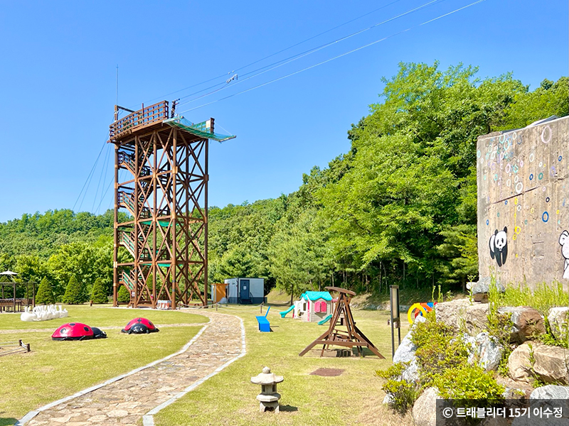 특히 집라인은 각각 다른 길이와 속도감을 가진 5개의 구간으로 나누어져 있어 다채로운 매력을 느낄 수 있습니다. 1구간과 2구간을 이어주는 구름다리에서는 자연휴양림을 한눈에 내려다볼 수 있어요.