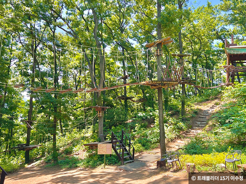 특히 집라인은 각각 다른 길이와 속도감을 가진 5개의 구간으로 나누어져 있어 다채로운 매력을 느낄 수 있습니다. 1구간과 2구간을 이어주는 구름다리에서는 자연휴양림을 한눈에 내려다볼 수 있어요.