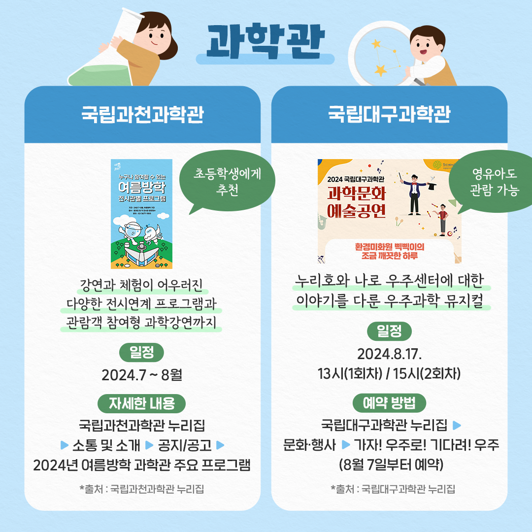 · 자세한 내용: 국립과천과학관 누리집 → 소통 및 소개 → 공지/공고 → 2024년 여름방학 과학관 주요 프로그램