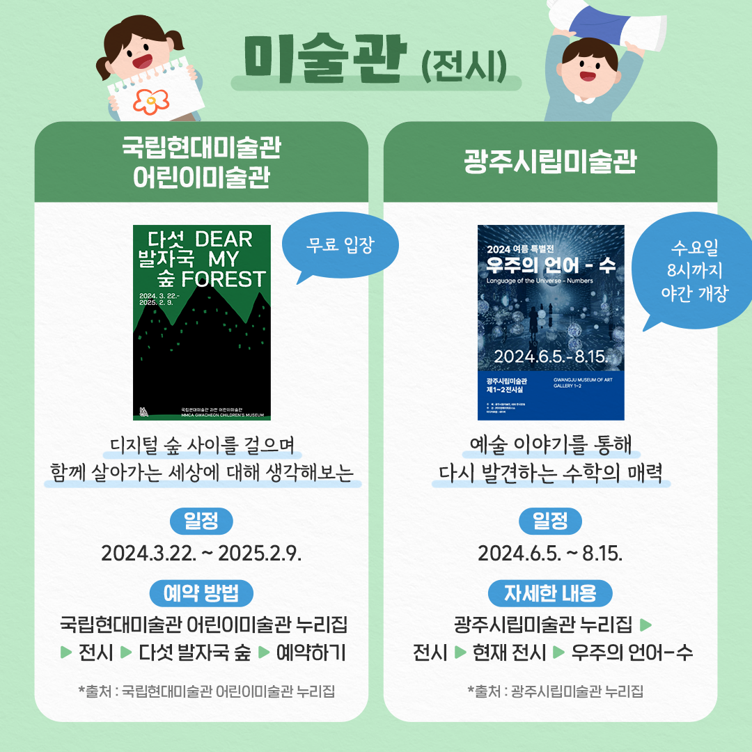 · 예약 방법: 국립현대미술관 어린이미술관 누리집 → 전시 → 다섯 발자국 숲 → 예약하기