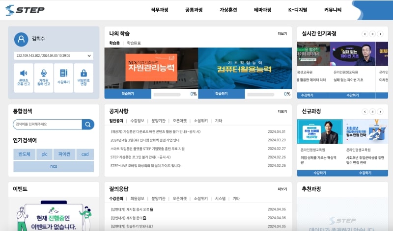 평생직업능력개발 플랫폼 STEP 홈페이지 메인 화면.
