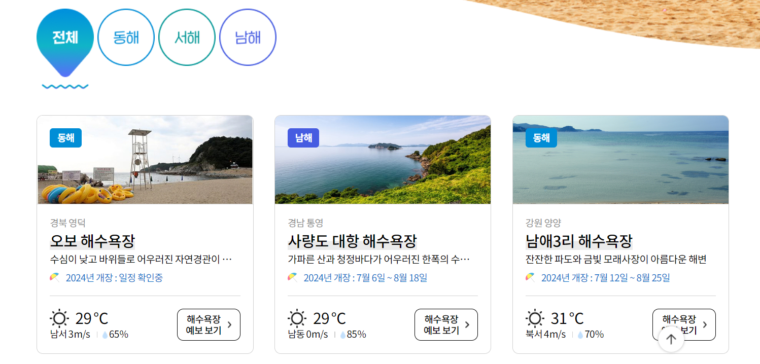 전체, 동해, 서해, 남해 중 클릭하여 해당지역 해수욕장 목록 확인 가능