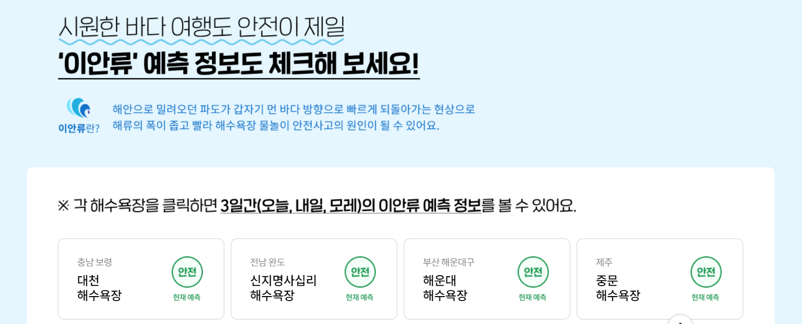 기상청과 함께 제공하는 페이지로, 해수욕장 관련한 다양안 정보 제공.