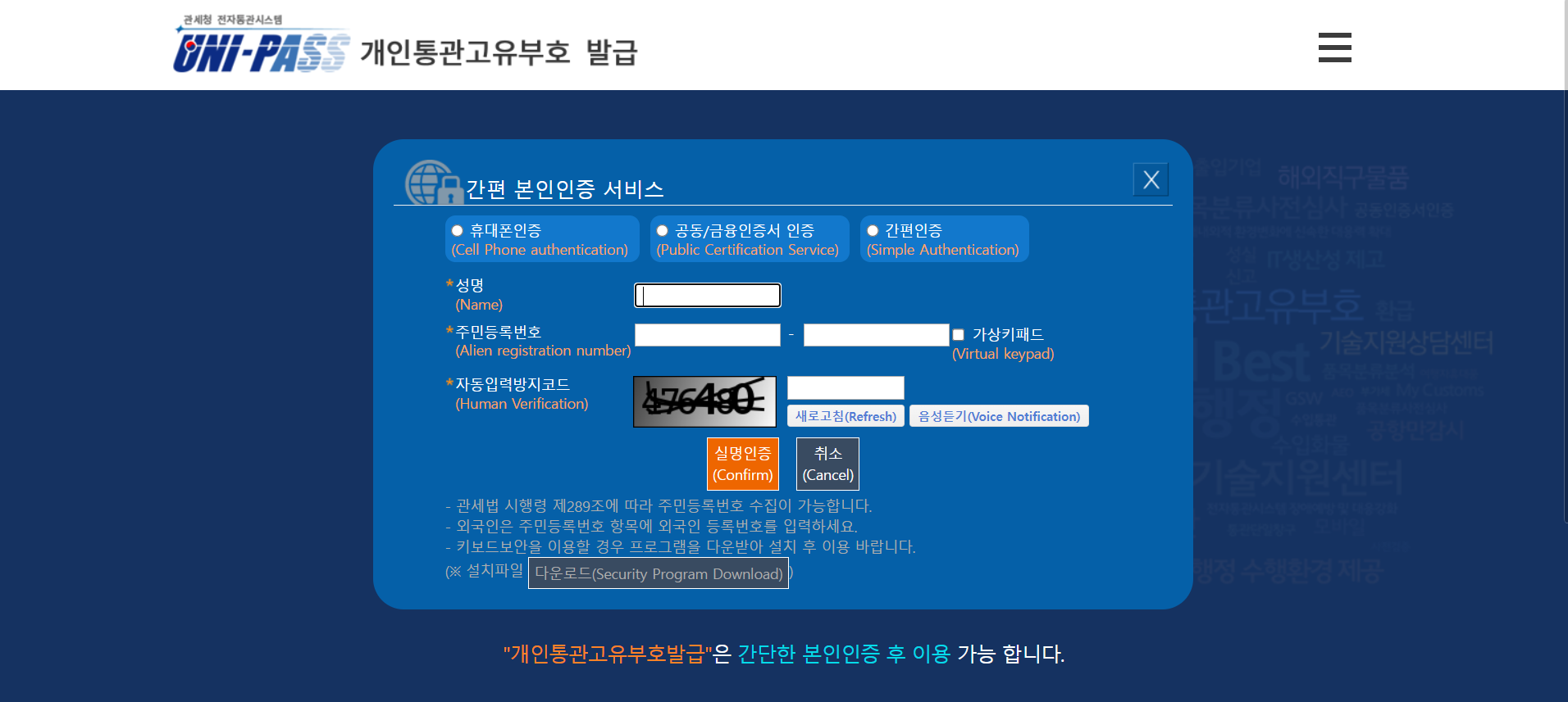 관세청 홈페이지 ≫ 개인통관고유부호 발급 ≫ 신규발급 or 조회 ≫ 본인인증