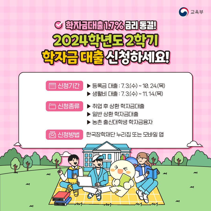 학자금대출 1.7% 금리 동결! 2024학년도 2학기 학자금 대출 신청하세요!