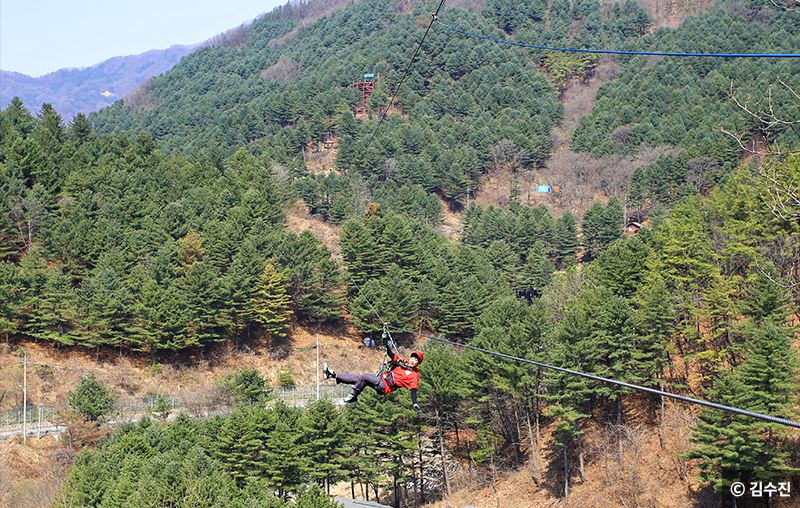 차량을 이용해 상부의 1코스에 오른 후 집라인을 타고 산과 계곡을 누비며 아래로 내려오게 되는데 초반부는 체험객의 실전 적응을 돕기 위해 초급자 수준으로 설계 했다. 후반부는 300m대부터 500m대에 이르는 긴 코스로 구성되는데, 칼봉산 능선을 따라 반대편 산으로 날아가는 7코스와 전 구간 중 가장 긴 528m 길이의 8코스가 하이라이트로 꼽힌다. 후반으로 갈수록 점차 여유가 생기면서 집라인의 짜릿함과 주변 풍경에 온전히 집중하게 된다.