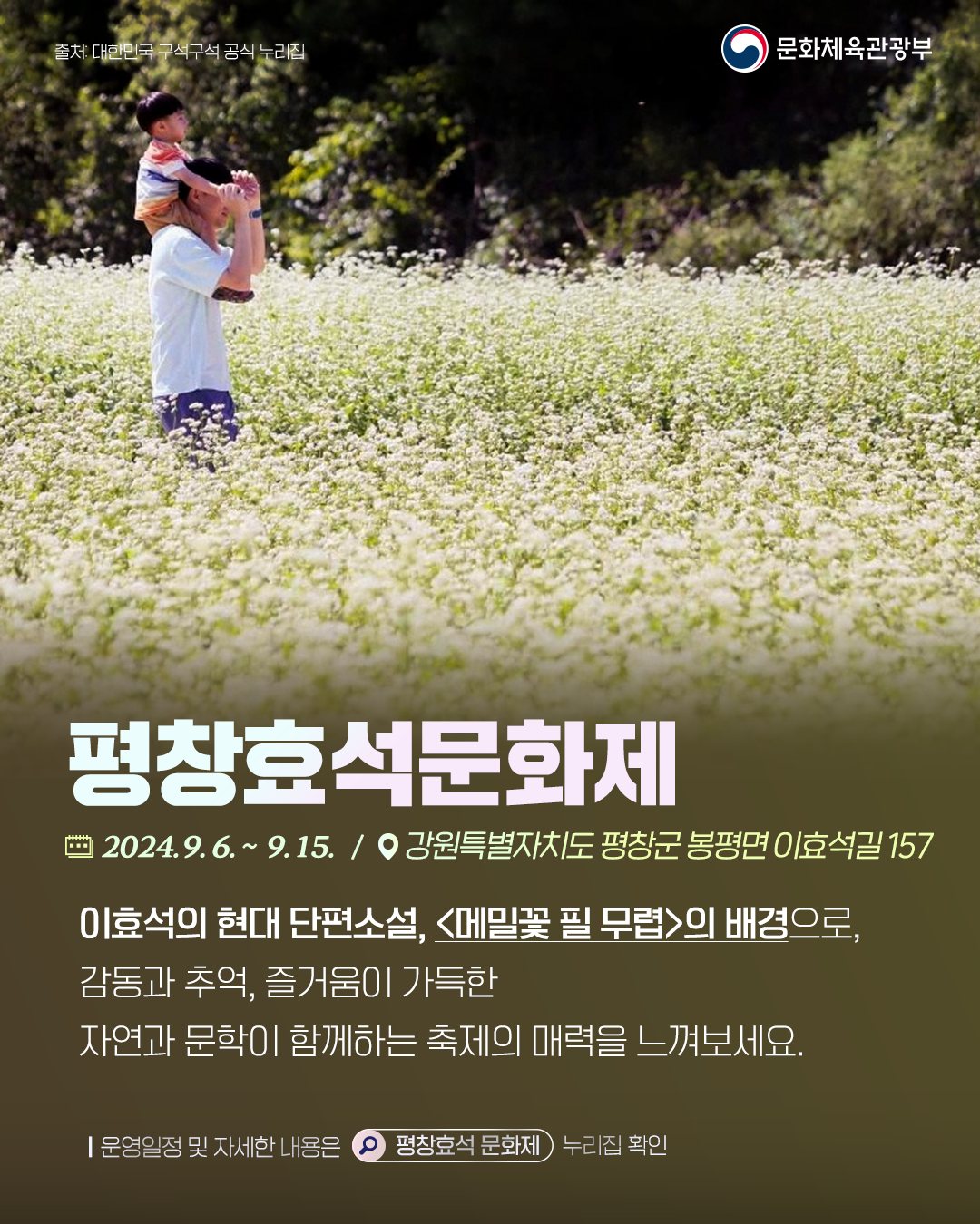 이효석의 현대 단편소설, <메밀꽃 필 무렵>의 배경으로, 감동과 추억, 즐거움이 가득한 자연과 문학이 함께하는 축제의 매력을 느껴보세요.